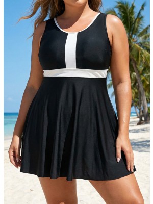 LILYEASE ® Black And White Color Block Round Neck Casual One Piece Swimdress