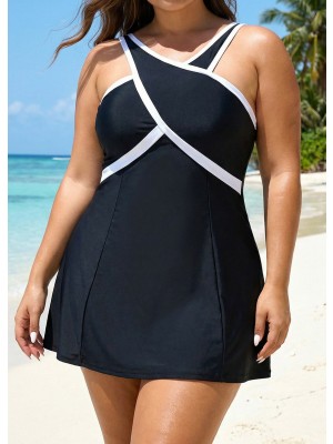 Final Sale LILYEASE ® Black And White Cross Front High Neck One Piece Swimdress