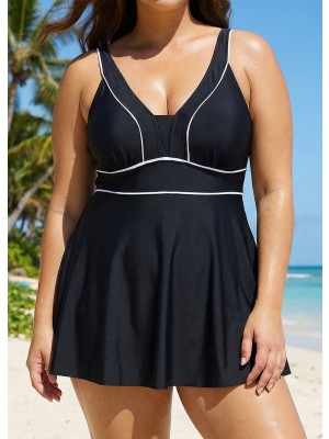Embrace modern elegance with this one piece swimsuit with skirt! The color block design features a Vneck with white line accents and adjustable straps.Fixed pads provide great support,making it perfect for plus size women.