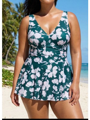 Green Floral Tummy Control Plus Size Swimsuit Swimwear One Piece Swimdress