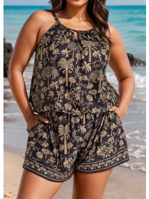 Plus Size Black Print High Neck Hollow With Pocket One Piece Swimsuit Swim Romper