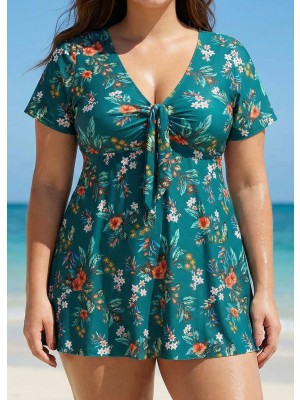 Plus Size Green Floral Short Sleeve Ladies Bathing Suits Swimdress Set