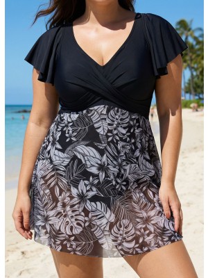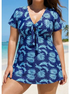 Step out in style with this twopiece swimsuit with shorts! The Vneck floral top features a charming bust tie,paired with lowrise swim briefs.Removable pads add comfort,perfect for curvy and plus size women seeking trendy swimwear.