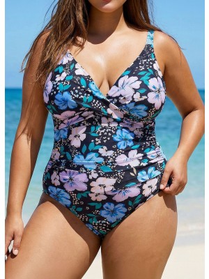 Dive into effortless elegance! This blue floral onepiece swimsuit has a Vneck,adjustable straps,removable pads,and tummy control with flattering wrap and ruched crossfront design.Ideal plus size bathing costumes choice.