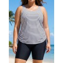 Curvy Black Stripe Drawstring Color Block Women'S Swimsuit Tankini Top