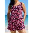Plus Size Pink Floral Modest Wide Straps Pocket Women's Swimsuit One Piece Swim Romper