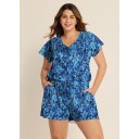 Blue Leaf V Neck Upf50+ Short Sleeves Vintage Pocket Curvy Swimsuit One Piece Swim Romper