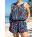 Blue Red Floral Keyhole Neck Vintage Pocket Curvy Women's Swimsuit One Piece Swim Romper