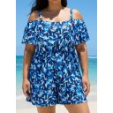 Blue Floral Print Vintage Off Shoulder Ruffled Plus Size Swimsuit One Piece Swim Romper