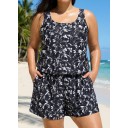 Plus Size Black White Leaf Modest Wide Straps Pocket Women's Swimsuit One Piece Swim Romper