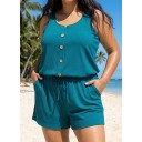 Navy Round Neck Plus Size Button Drawstring Women's One Piece Swimsuit