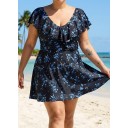 Blue Floral Print V Neck Cap Sleeves Flattering Ruffles Curvy Swimsuit Swimdress Set