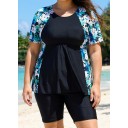 Plus Size Blue Floral Scoop Neck Upf50+ Short Sleeves Vintage Women's Swimsuit Shirt Tankini Top