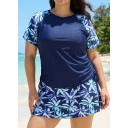 Plus Size Blue Leaf Upf50+ Short Sleeves Modest Side Drawstring Women's Swimsuit Tankini Top