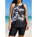 Plus Size Black Tropical Floral Print High Neck Modest Women's Swimsuit Tankini Top