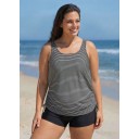 Plus Size White Stripe Scoop Neck Vintage Drawstring Women's Swimsuit Tankini Top