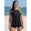 Orange Tropical Floral Print Upf50+ Short Sleeves Vintage Curvy Swimsuit Tankini Top