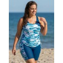 Plus Size Blue And White Palm Trees Scoop Neck Vintage Women's Swimsuit Tankini Set
