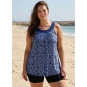 Plus Size Blue Paisley Print Scoop Neck Sleeveless Casual Padded Women's Swimsuit Tankini Top