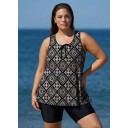 Black Geometric Print Vintage Wide Strap Loose Fit Plus Size Women's Swimsuit Tankini Top