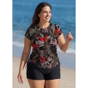 Plus Size Black Leaf Upf50+ Short Sleeves Zipper Drawstring Women's Swimsuit Tankini Top
