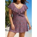 Plus Size Floral Print V-Neck Sleeves Swimdress Top