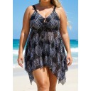 Mesh Print Tie-Front Drawstring Asymmetrical Hem Graceful Swimdress Set