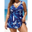 Blue Plant Print Ruched Wide Strap Fashionable One Piece Swimdress