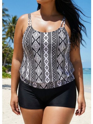 Vintage Geometric Print Double Straps Tankini Top