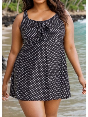 Feel confident in this one piece swim dress plus size! Square neck with classic polka dot pattern and a charming bust tie. Fixed pads and adjustable straps provide excellent bust coverage—ideal for curvy women.
